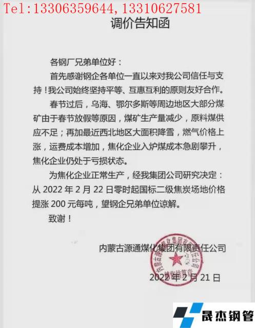 考慮運費等價格上漲,自2月22日零時起對二級焦炭價格上調200元/噸,具體內容如下: